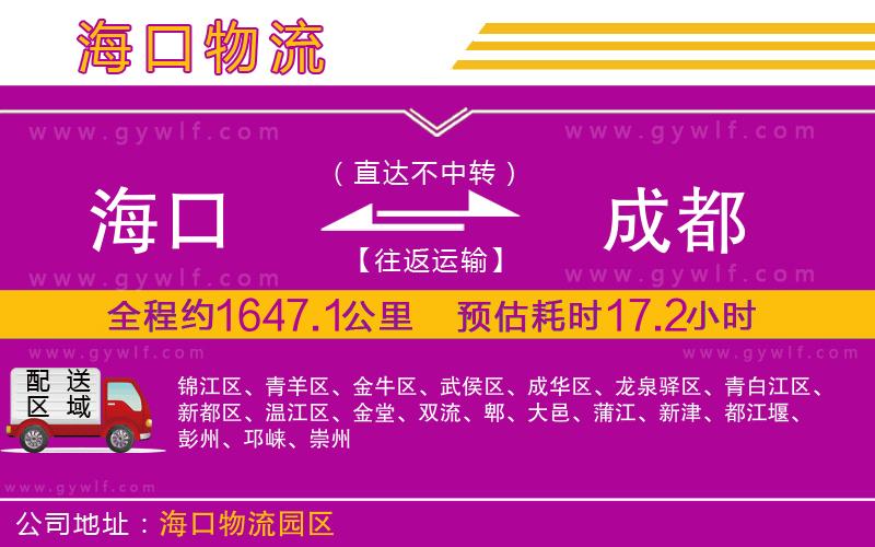 ??谥?a href="http://m.52iwan.cn/" target="_blank">成都物流公司全程約1647.1公里,專線運(yùn)輸用時(shí)大約17.2 小時(shí),可運(yùn)輸直達(dá)錦江區(qū)、青羊區(qū)、金牛區(qū)、武侯區(qū)、成華區(qū)、龍泉驛區(qū)、青白江區(qū)、新都區(qū)、溫江區(qū)、金堂、雙流、郫、大邑、蒲江、新津、都江堰、彭州、邛崍、崇州;羊程物流可承接:整車運(yùn)輸、零擔(dān)運(yùn)輸、大件運(yùn)輸、轎車托運(yùn)、危險(xiǎn)品運(yùn)輸、機(jī)械設(shè)備運(yùn)輸、汽車配件運(yùn)輸、食品飲料運(yùn)輸、辦公家具運(yùn)輸、電子電器運(yùn)輸、行李搬家物流運(yùn)輸、電動(dòng)車摩托車托運(yùn)等貨物的物流業(yè)務(wù);全程直達(dá),無需中轉(zhuǎn),海口到成都的專線能實(shí)現(xiàn)每天發(fā)車,可上門提貨,送貨到點(diǎn),為工廠、貿(mào)易商、批發(fā)商、電商以及個(gè)人等貨主提供貨物安全有保障的運(yùn)輸服務(wù),那??诘匠啥歼@條快運(yùn)專線運(yùn)費(fèi)怎么算,下面我們來詳細(xì)介紹下。